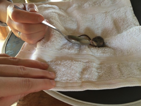 Kathryn feeding the baby mouse milk from a spoon.