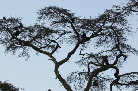 Baboons hanging out in an acacia.