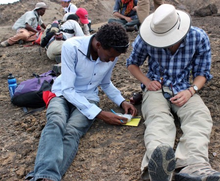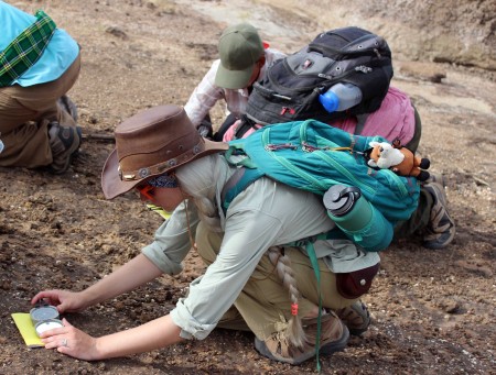 Rob and Niguss use the brunton compass to measure strike and dip.