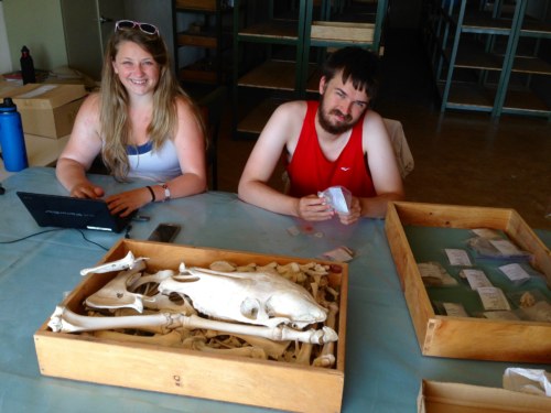 The third group, consisting of Nathan and Kelly, used mesowear of a range of fossil mammals to reconstruct the diet, and indirectly the paleoenvironment, of these animals. Mesowear methods incorporate the crown topography (either high or low) and the cusp shape (either sharp, rounded, or blunt) to quantify the amount and type of wear on the tooth crown. These data will reveal whether the fauna at a certain site mainly consisted of browsers (eating soft leaves from trees and bushes), grazers (eating tough grasses), or a mix of both. When comparing the reconstructed diets from different sites and different time periods, mesowear can be used the reconstruct the changes in paleoenvironment through time. With Dr. Jason Lewis’ help, Nathan and Kelly scored numerous teeth for mesowear and quickly learned the importance of careful sample selection and consistent measuring methods.