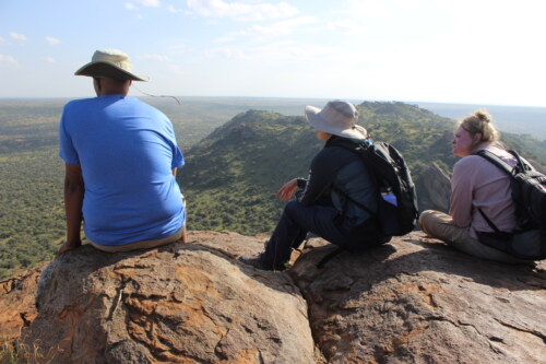 Dr. Martins and field school students; Deb and Maddie look out over the Mpala landscape.