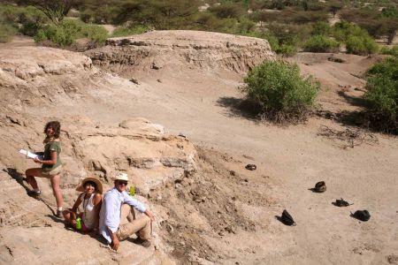 Meadow, Priscilla and Peter look up from lakebed sediments of the Epim exposures.