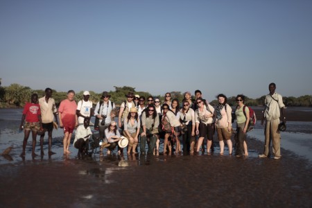 Students in the Journalism Without Walls program, along with their professors (Ilana Ozernoy, kneeling second from left, and Barbara Selvin, standing second from right) and translators from TBI, pose in the middle of crossing the Turkwel River, which flows beneath the institute. TBI Director Lawrence Martin, standing third from left, helped team members through the deepest stretch of the crossing.