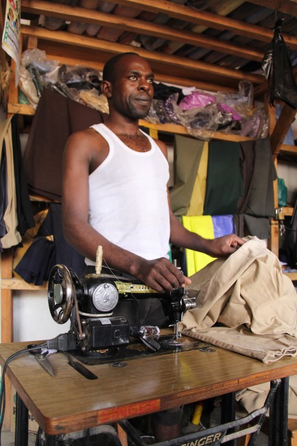 A tailor in Lodwar uses a treadle Singer sewing machine to patch up Tim's field pants so they can live to fight another day.