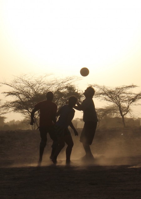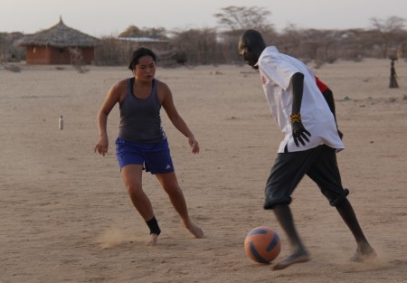 After the kick off, we go until the sun sets. None of the field school students play soccer regularly at home, but in the sands of Turkana we’ve rekindled latent soccer skills from high school teams (Sam and Holly), elementary school rabble-ball (me, Natalie), or skills just born of competitive enthusiasm (Rob, Meg, Ingrid, Cory). Each game is played at full tilt with the Kenyans and Americans+Canadians+Kenyans never slowing for a water break or to let the dust settle.