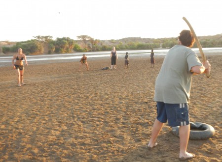 Holly is on the mound (or the pit) as Rob stares her down with his Turkwel Slugger. Ashley celebrated her birthday with her first doum ball game. She singled and waits for Rob to bring her home…through a lot of mud.