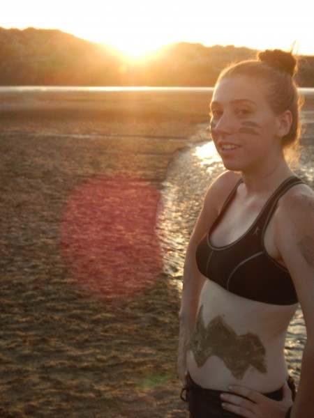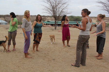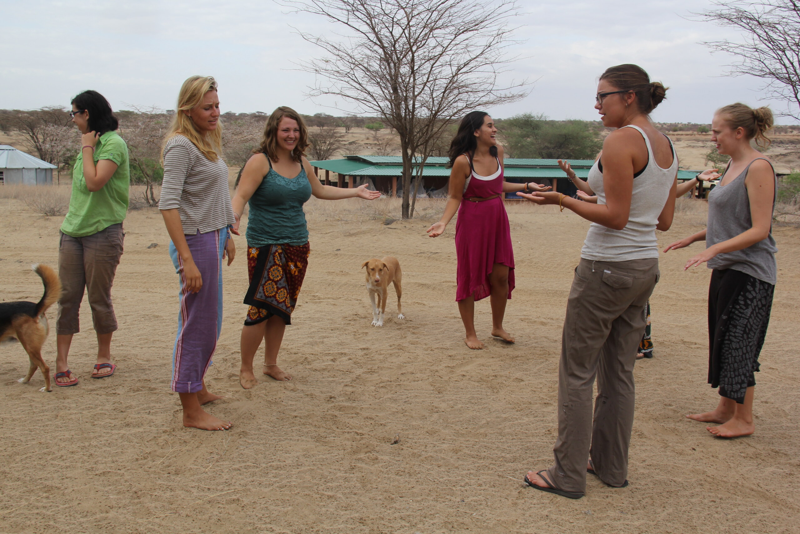 During class the rain started to pound the sheet metal roof and the students were dismissed to frolic. Once everyone got out in the drizzle to dance, we discovered the metal roof really magnified the sound of the light drizzle. Rain dancers from left to right: Ashley, Acacia, Rosie, Poppy (camp dog), Eve, Cory, and Meg.