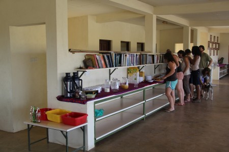 Sunday morning breakfast queue. Leanna leads the pack after a long run along the loose, sandy track leading away from camp towards Lodwar. Note the TBI library with it’s eclectic selection ranging from classic volumes on Olduvai Gorge to Bill Bryson memoirs. I brought plenty to read, but have decided to take care of this library while I have the chance.