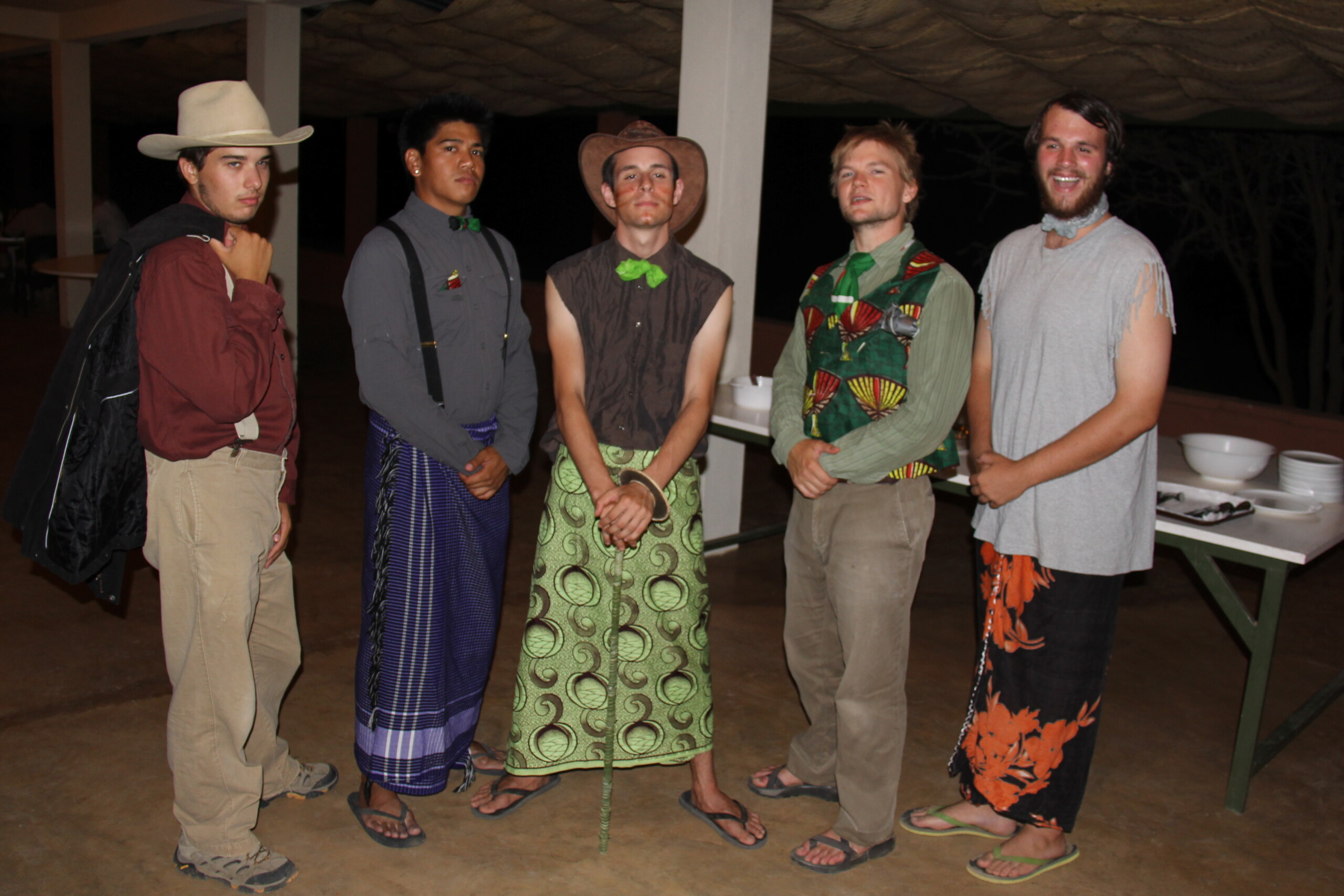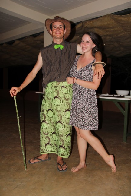 The men of TBI class it up for prom. Everyone opted for the bandana tie. Aaron (center) made a doum palm cane and sports a Turkana wrist knife. Tim (left) brought out the suspenders for the occasion and shared with Rob (second from left) who created the formal kikoi ensemble. Matt (second from the right) went for the kikoi vest and duct tape boutonniere look while John (right) went with the slicked over hair, twirled mustache and tasseled t-shirt. Classy gents.