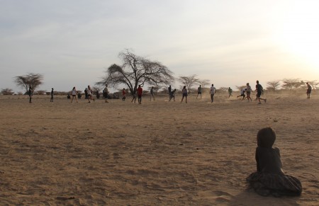 A few weeks ago, a soccer ball arrived in camp (or “football” depending on which side of the pond you’re from) and Acacia orchestrated a match between the staff and students. The Sunday soccer game has become a fixture of the off-day routine with the excavation crew members and institute staff facing off against a field school team. We walk out about a kilometer from camp to a field that has been cleared of Indigofera thorns. The goals are mounds of sand marked with sandals or water bottles. The field is close to the center of the small village near South Turkwel, and children and some villagers come to the field to watch the match and occasionally contribute a kick or two.