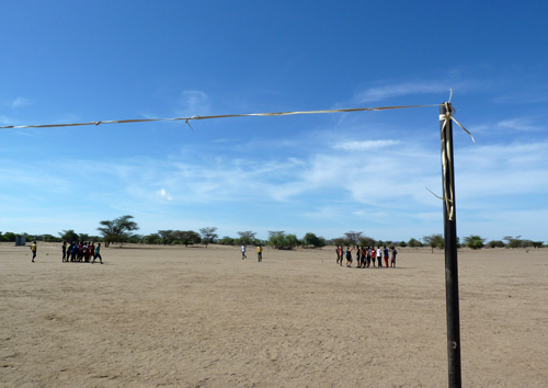 The game is on! TBI (right) faces Nakwaperit Primary School (left).
