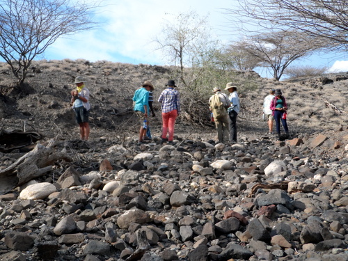 Following a lunch break under a shady tree near Kokiselei 6, the students headed down to the Kokiselei laga to collect phonolite cobbles and basalt hammerstones to take back to TBI for knapping. They then visited Nadung’a where there is a stromatolite formation to collect red and green rhyolite for knapping too.
