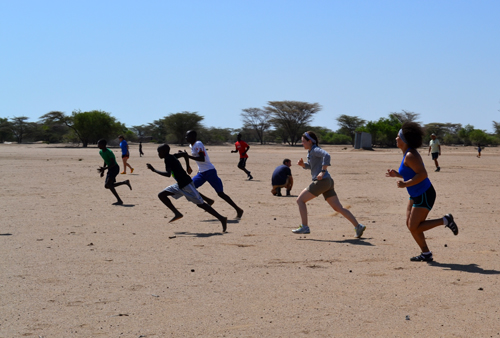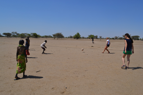 During the Field School, students have class Monday through Saturday, with Sundays off for rest and relaxation. Often, Dr. Martins will organize Sunday activities for those students who crave a little more excitement on their day off. Last Sunday morning, all fifteen Field School students, plus several members of the TBI staff, headed to nearby Nakweperit Primary School to play a friendly game of football (soccer for our American readers) with local students and villagers. Field School student Letty was on photography duty and took all of the lovely photos in this post – thanks, Letty!