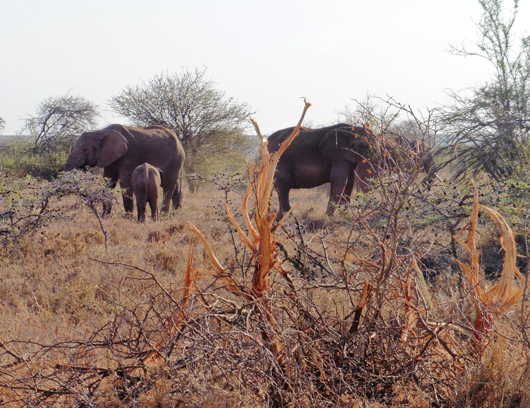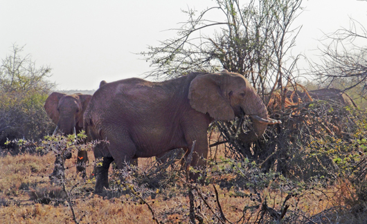 Students have been learning about how important these grazing and browsing animals are in terms of the landscape and ecology. Elephants are quite literally, ecosystem engineers, shaping the vegetation by feeding on trees, like they are here on a species of Wait-A-Bit acacia (Acacia mellifera). The older matriarch was the one breaking off branches and deftly using one of her front legs, holding them down to strip off the bark, which is a favourite food of the elephants in the dry season. She conveniently dropped extra branches on the ground for the younger elephants to feed from. This action of elephants creates a more complex habitat by limiting the spread of bushes, allowing grasses and other species to flourish that might have been overshadowed by the acacias and other woody vegetation. At a landscape level, this creates more diversity of micro-habitats and allows for a wider range of species to survive.
