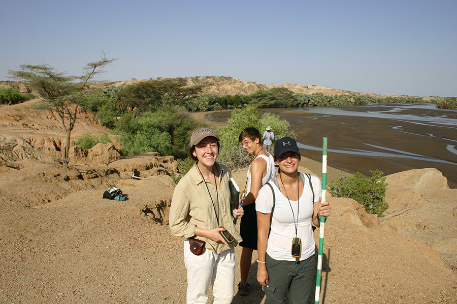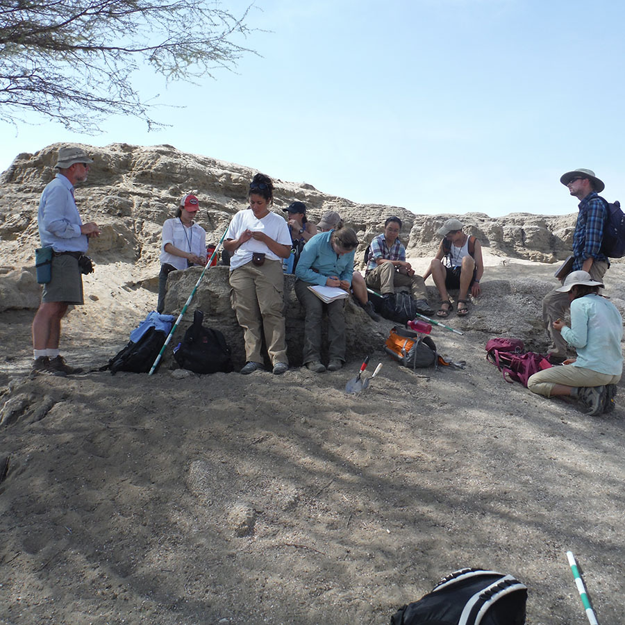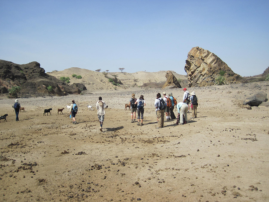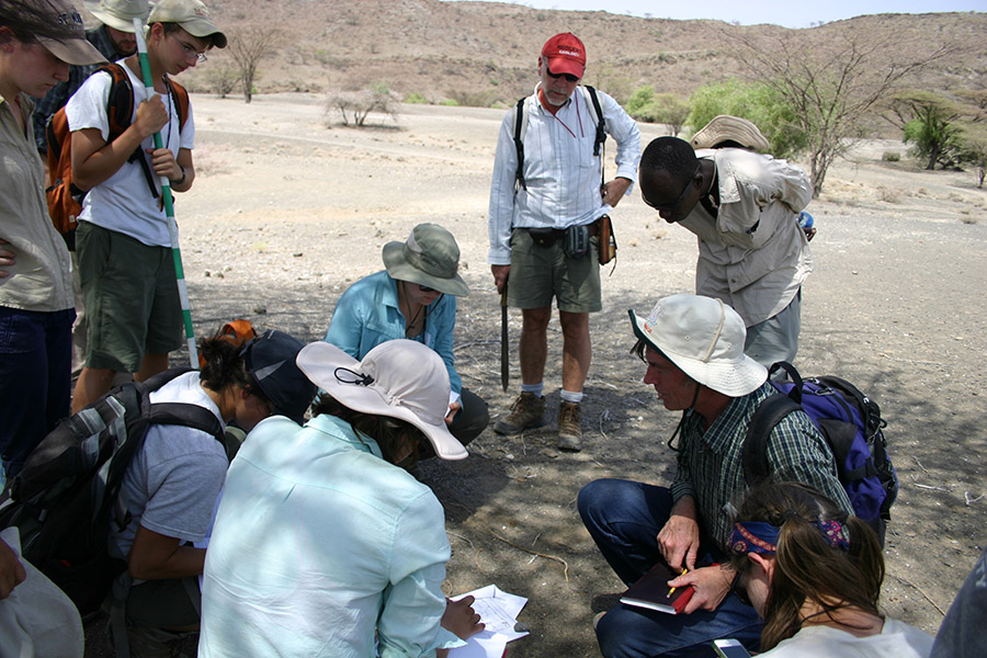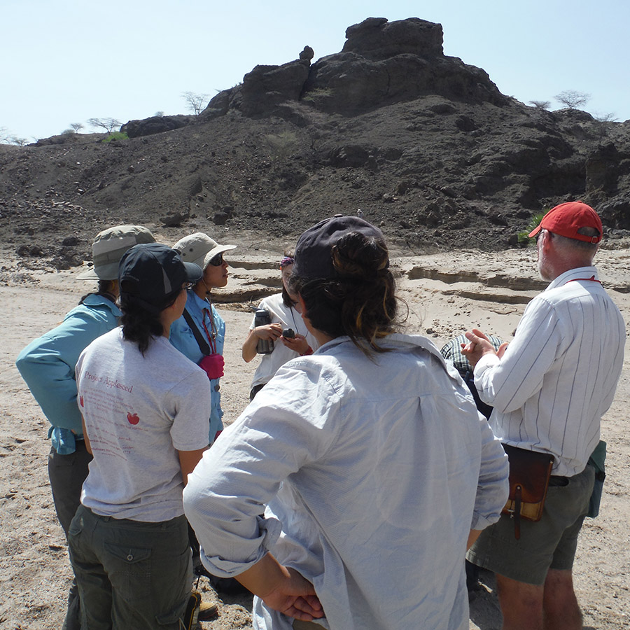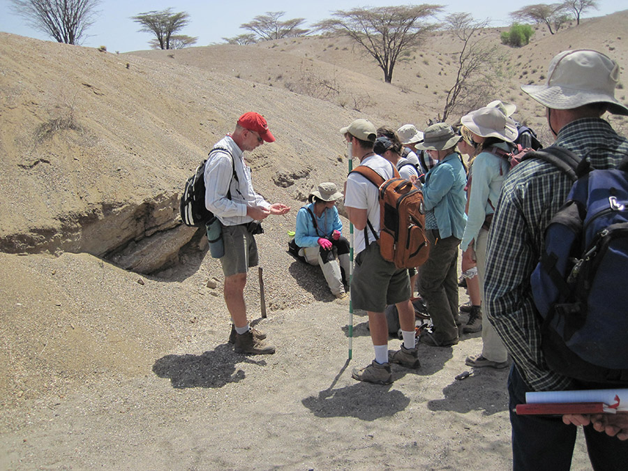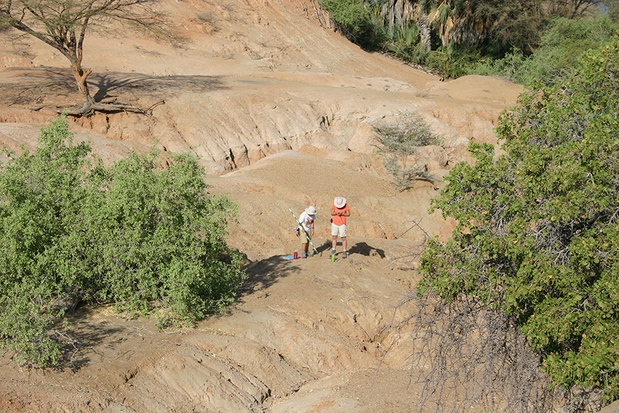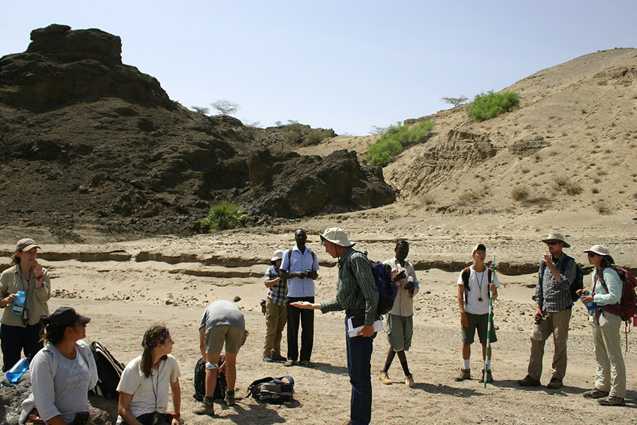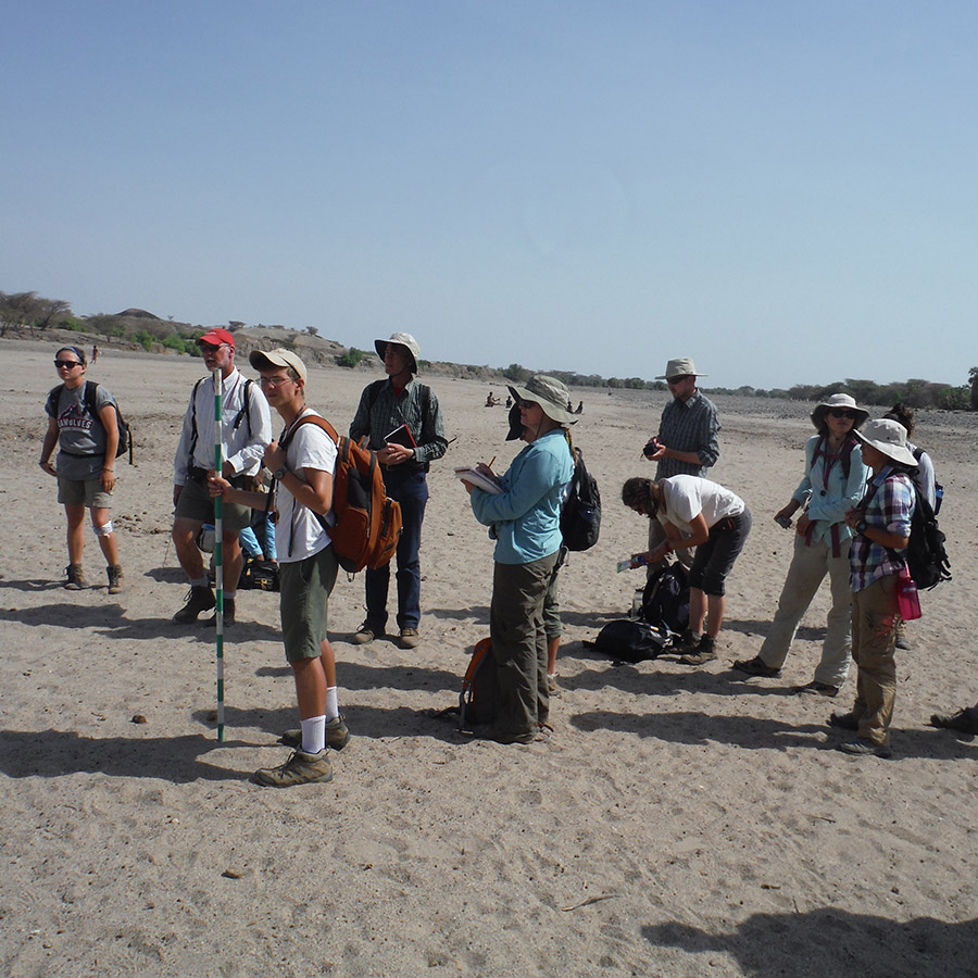 Professor Reynolds points out how the gravel in this river differ from what we’ve seen near the Turkwel River. Behind the group you can see <10,000 year old lake beds resting against ~25 million year old basalts. In addition, Professor Reynolds points out the major fault that is located at the eastern boundary of the Lothidok Range and extends to “Cellphone Hill” near TBI.