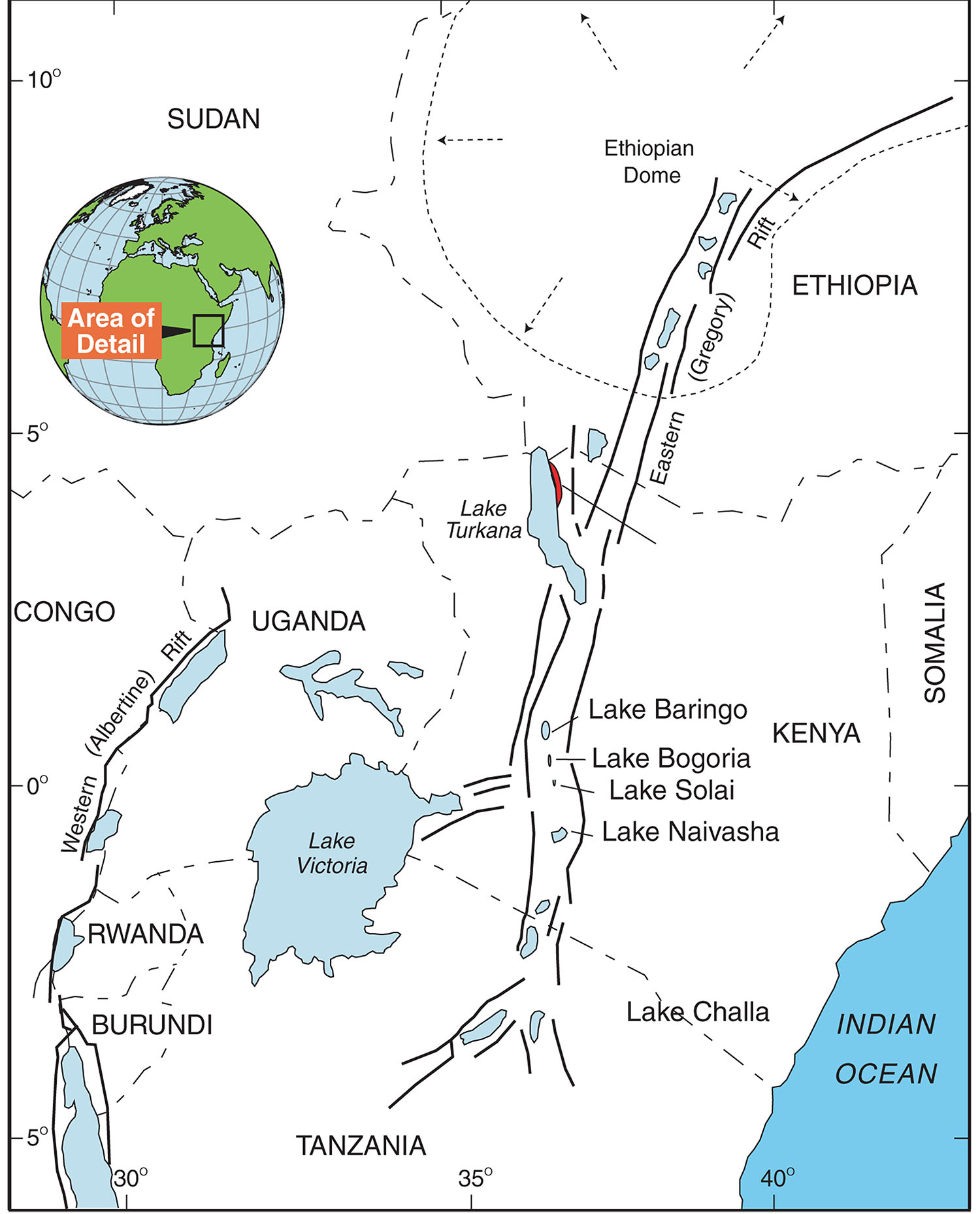 Lake Turkana is located with the eastern branch of the East African Rift System. Figure from Ashley et al., 2011
