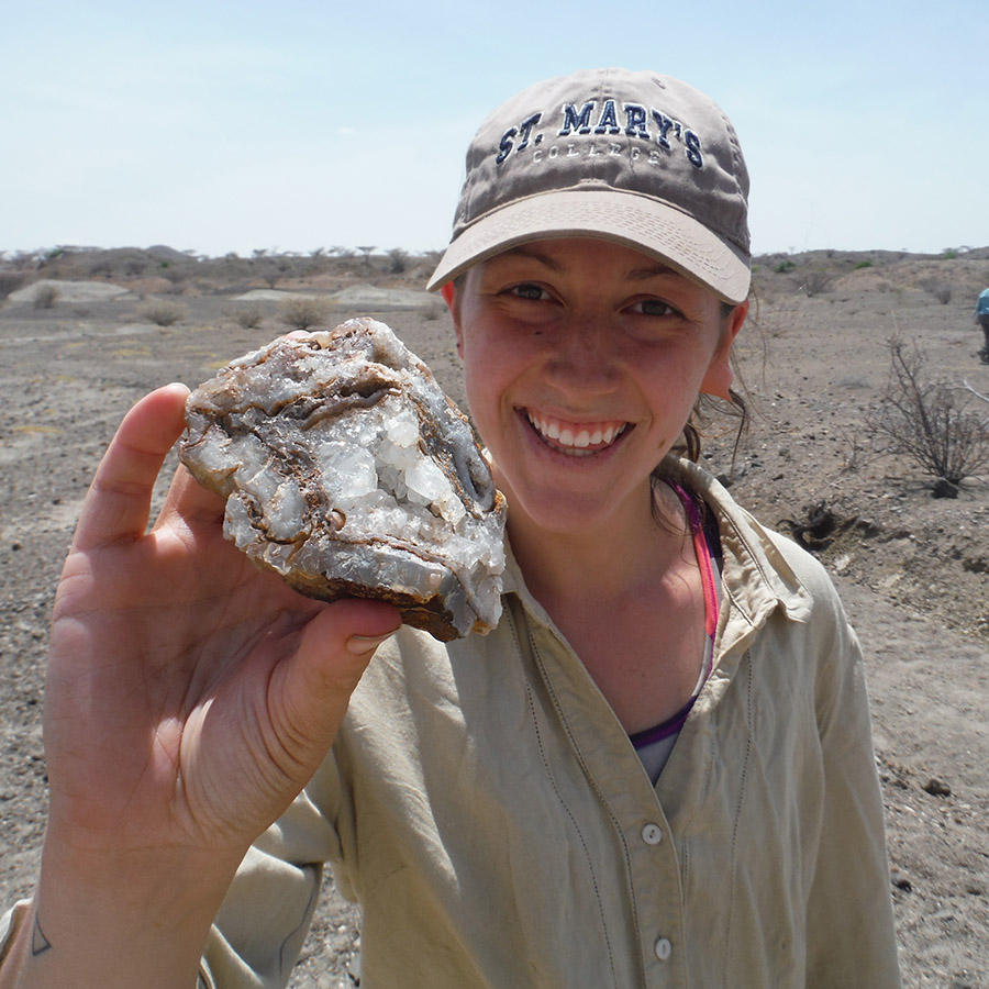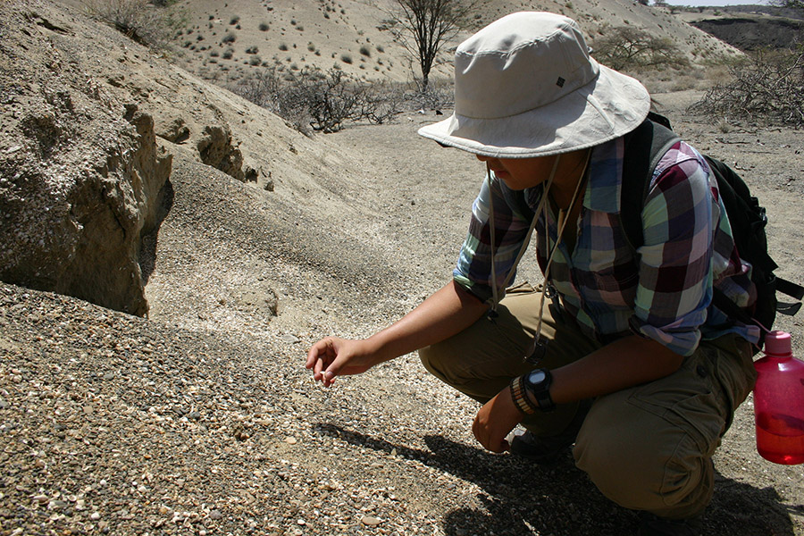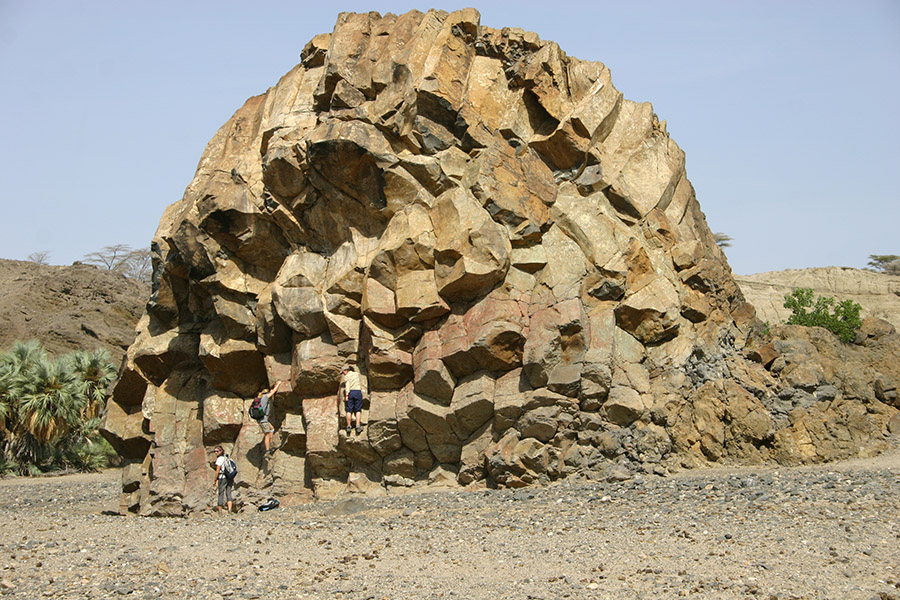 Kabua Gorge, cut by the Kalakol River, was our first trip to examine paleo-lake deposits. This location exposes ~10,000 year old and younger lacustrine sedimentary beds resting on top of and adjacent to Miocene volcanics. The present water level of Lake Turkana is approximately 368 meters above sea level. During a humid period in the Turkana Basin (and most of northern Africa), lake levels in the basin reached up to 456 m asl, an overflow point into the Nile drainage basin. In the area of Kabua Gorge, the paleo-Kalokol River had cut down into the faulted volcanic deposits that make up the Lothidok Range. Much later, the area was inundated by lake highstands during the Holocene and deposited shell rich sands at the shore and siltstones in deeper water.