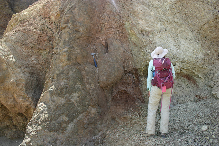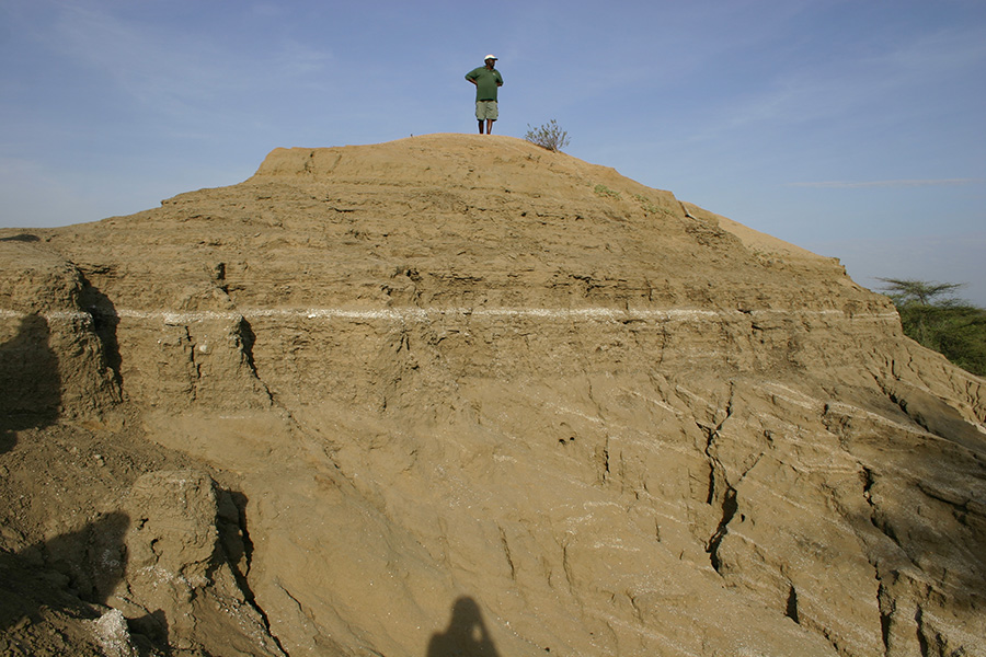 Dr. Feibel describes the Turkana region when Lake Lonyumun occupied the basin. Here, the 4.1 million year old lacustrine claystones lie unconformably next to and on top of ~ 24 million year old volcanic deposits in the Lothidok Range. The age of the lake beds is based on a nearby Moiti tuff (not shown but is approximately 3.97 million years old based on radiometric dating).