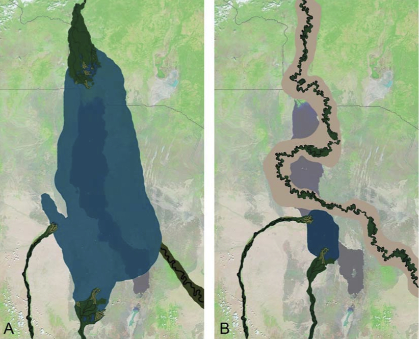 When the Turkana Basin was not dominated by river systems, the rock record indicates several paleo-lakes occupied the region and sometimes reached over 100 kilometers away from the present lake margin. Instead of just recording the depositional environments that have occurred, a field geologist will try to determine the causes of such changes in order to reconstruct what the landscape looked like at different periods of time. Why did fluvial systems occupy the Turkana Basin for a greater period of time than lakes? How do lakes form? Where does it get its water? And other questions that will not be answered in this module – What type of life occurred in the Turkana Basin? Where? When? Why in that particular location?