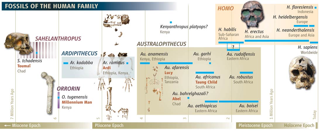 There is still debate on whether our ancestors became bipedal from a terrestrial or arboreal ancestor and why (shift to savannah, hands to carry, threat, thermoregulation, etc.). Whatever the case, during the Late Miocene the earliest putative hominins appear in Chad, Kenya, and Ethiopia. The diagram below is a timeline showing the age and appearance of each hominin species and is our current understanding of human evolution. Another great diagram and interactive website is Human Family Tree from the Smithsonian.