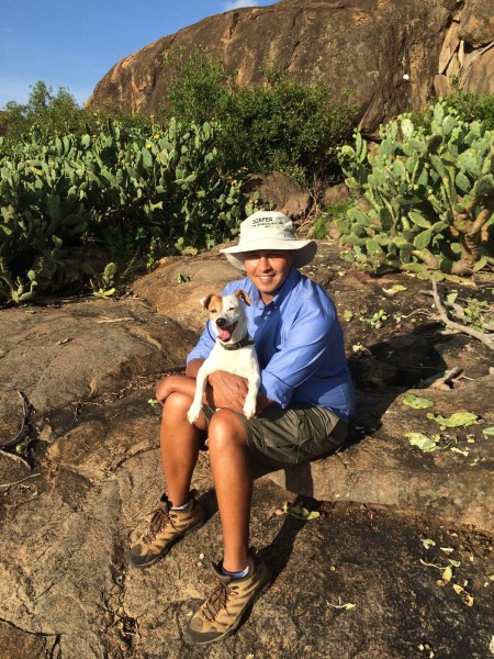 Dr. Dino Martins and our new mascot, barabara. Note the invasive prickly pear cacti that was unfortunately introduced to the area years ago.