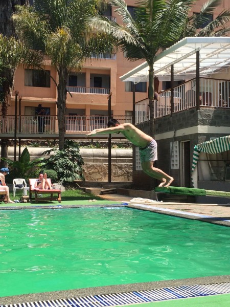 Ryan jumping off the diving board at a hotel pool we visited in town….last time we would be around such luxuries!