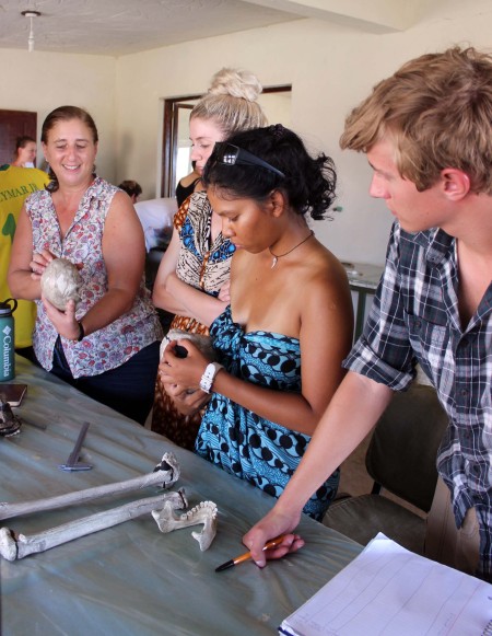 Dr. Rivera presented the class with a box full of replica human bones and asked the students to lay them out on the table in anatomical position. Armed with a workbook on human skeletal anatomy (and some help from certain students with a bit of anatomy background), the students pieced together the skeleton.
