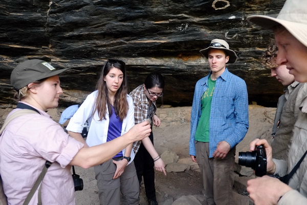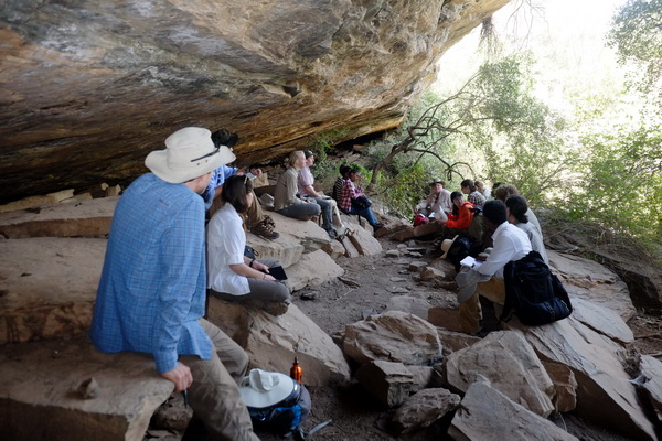 Students enjoying the cool breeze in the rock shelter