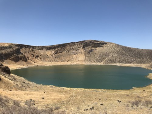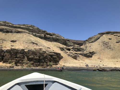 We spent the day at the island, which is actually a dormant volcano in the middle of Lake Turkana, formed by the same rifting action that is pulling eastern Africa away from mainland Africa, and caused the lake and the Turkana Basin to form. The island has three small lakes within it, two of which we visited. The first lake we went to was called Flamingo Lake, because it hosts thousands of flamingoes that live around the lake and eat brine shrimp and blue-green algae, which in turn keep their feathers pink. It was a steep hike up the side of the ridge, but it was worth the view we saw from the top of hundreds of flamingoes clustered around the edges of the smaller lake inside the crater.