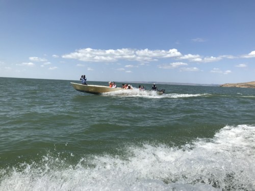 Our last week at TBI was an eventful one, with a lot of things to finish up before we packed up and came back home. We took a trip to Central Island, learned a great deal about human evolution, visited an important paleontological site, and had a goat roast. After a restful day last Saturday, we left TBI early Sunday morning to cross the river and head to Kalokol, a town about an hour and a half north of TBI. Once we got there, we checked in with the local KWS (Kenya Wildlife Services) station to see if the lake was calm enough to safely cross it, and then chartered two boats to take us to Central Island.