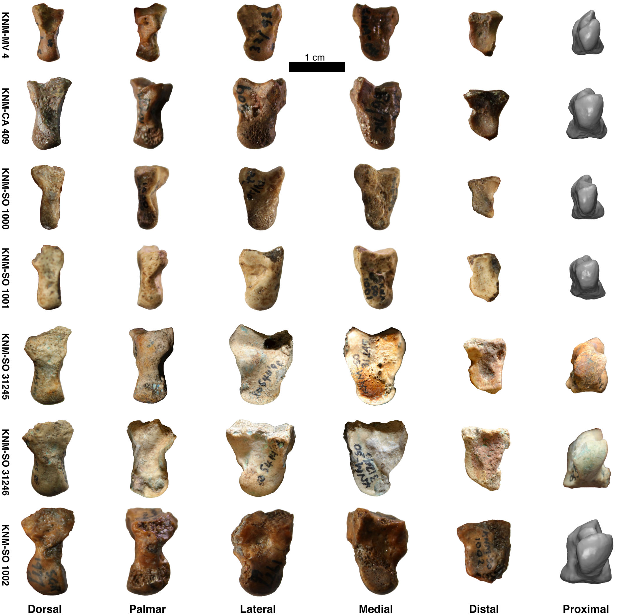 The study reported is based on the capitate, one of the eight “gummy-bear” sized bones that make up the wrist skeleton in humans, apes, and monkeys. The specimens were collected over a period of almost five decades from a collection of close sites in the Tinderet area in Western Kenya dated to approximately 20 mya. Using cutting edge computer modeling techniques and a battery of new sophisticated statistical analyses the shapes were compared to those of a broad range of living apes and monkeys. The study concludes that the capitates probably belonged to 7 different species ranging in size from 5Kg to 15Kg. While some of the specimens resembled those of monkeys, one specimen of a medium sized animal (15Kg) strikingly resembled the great apes. The specimen is tentatively assigned to Rangwapithecus, one of the two medium sized apes already known from jaws and teeth at the site. Whether the resemblance implies a close affinity to the ancestry of the great apes or is due to convergent wrist function will be tested in the future with the recovery of other parts of the skeleton of Rangwapithecus.