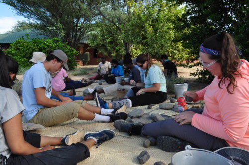 Students have been busy in their last week of the Archaeology module that marked the end of the fall semester. They have learned a lot in class about making stone tools, and with the phonolite and rhyolite they collected while camping at Nariokotome, it was time to practice making tools. The exercise was not a walk in the park as it required skill, precision, good dexterity, and power when striking.