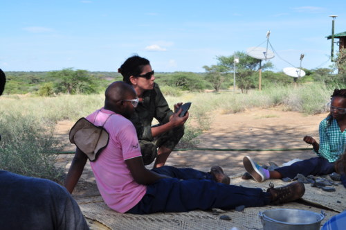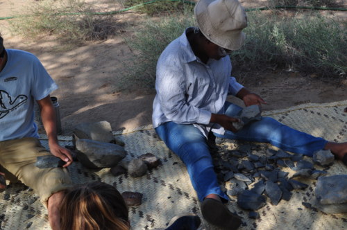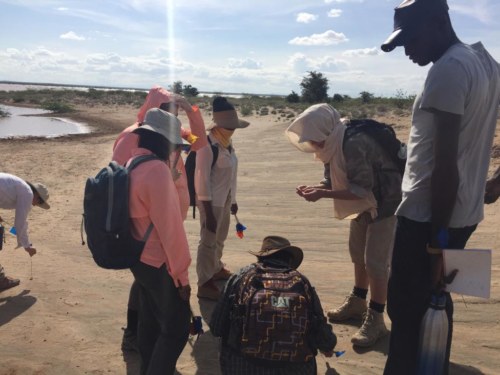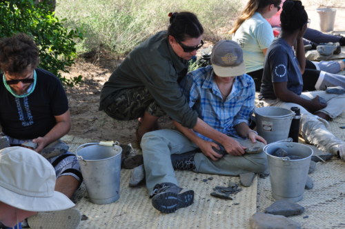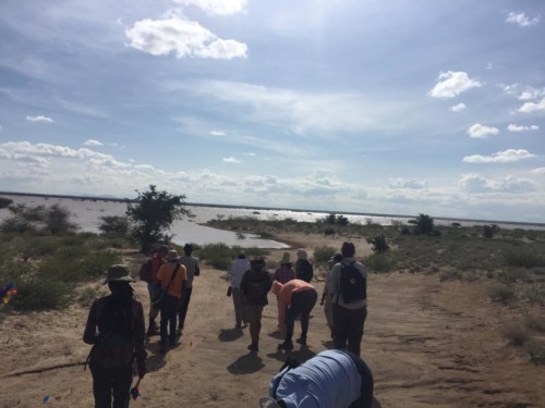 Our last field trip was to a Later Stone Age site called Aiyangyeng that sits at the edge of an ephemeral lake; part of the site was underwater because of the rains recently experienced in the area. Students flagged beautiful artifacts made of different raw materials. Dr. Harmand explained to the students that the site represented the later part of the Later Stone Age, as the artifacts present exhibited “microlithism” flaking from cores; the presence of decorated pot-sherds and ostrich eggshells signified the advent of modern human behavior.