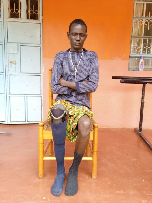 James Alkerech on receiving his prosthetic leg, ready for training on how to use it.